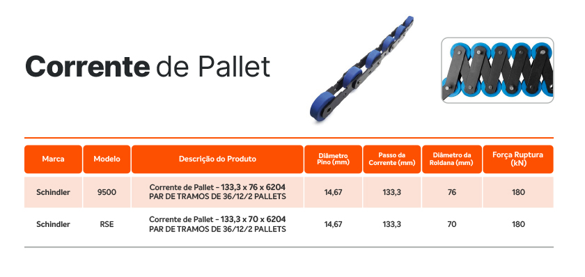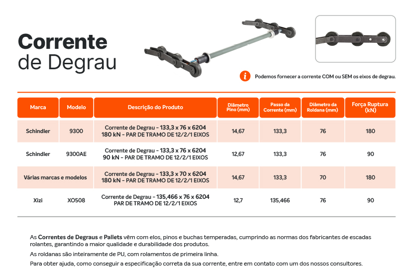 A corrente é um dos componentes centrais que impulsionam o movimento contínuo e suave das escadas rolantes. Ela desempenha um papel essencial na transmissão de energia entre os degraus, garantindo que o movimento seja sincronizado e confiável em todo o sistema.