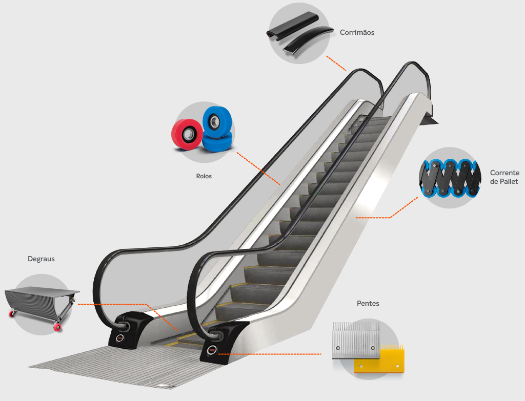 Além de fornecer suporte físico aos degraus, os rolos reduzem o impacto e ruído durante o funcionamento das escadas rolantes.